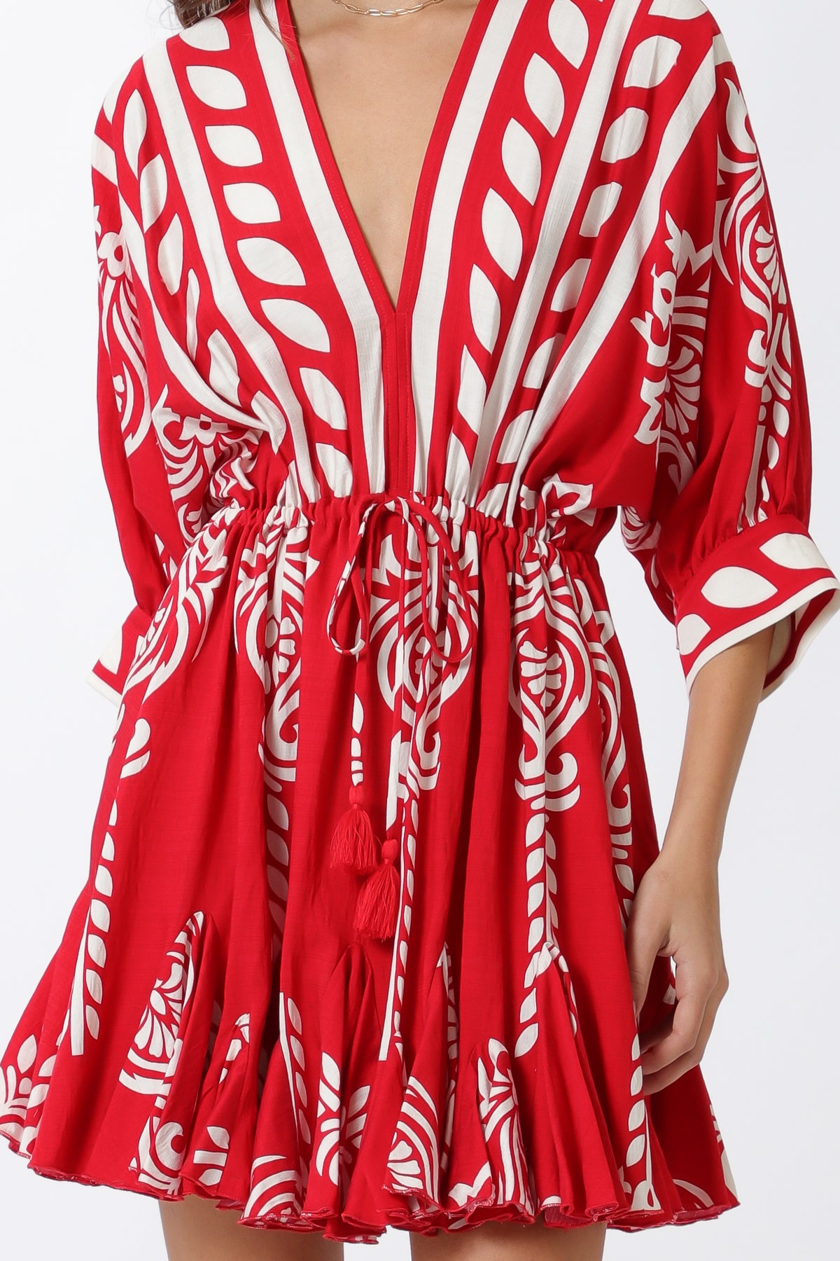 3/4 DOLMAN SLEEVE TIE WAIST WITH TASSEL TRIM DETAIL MINI DRESS