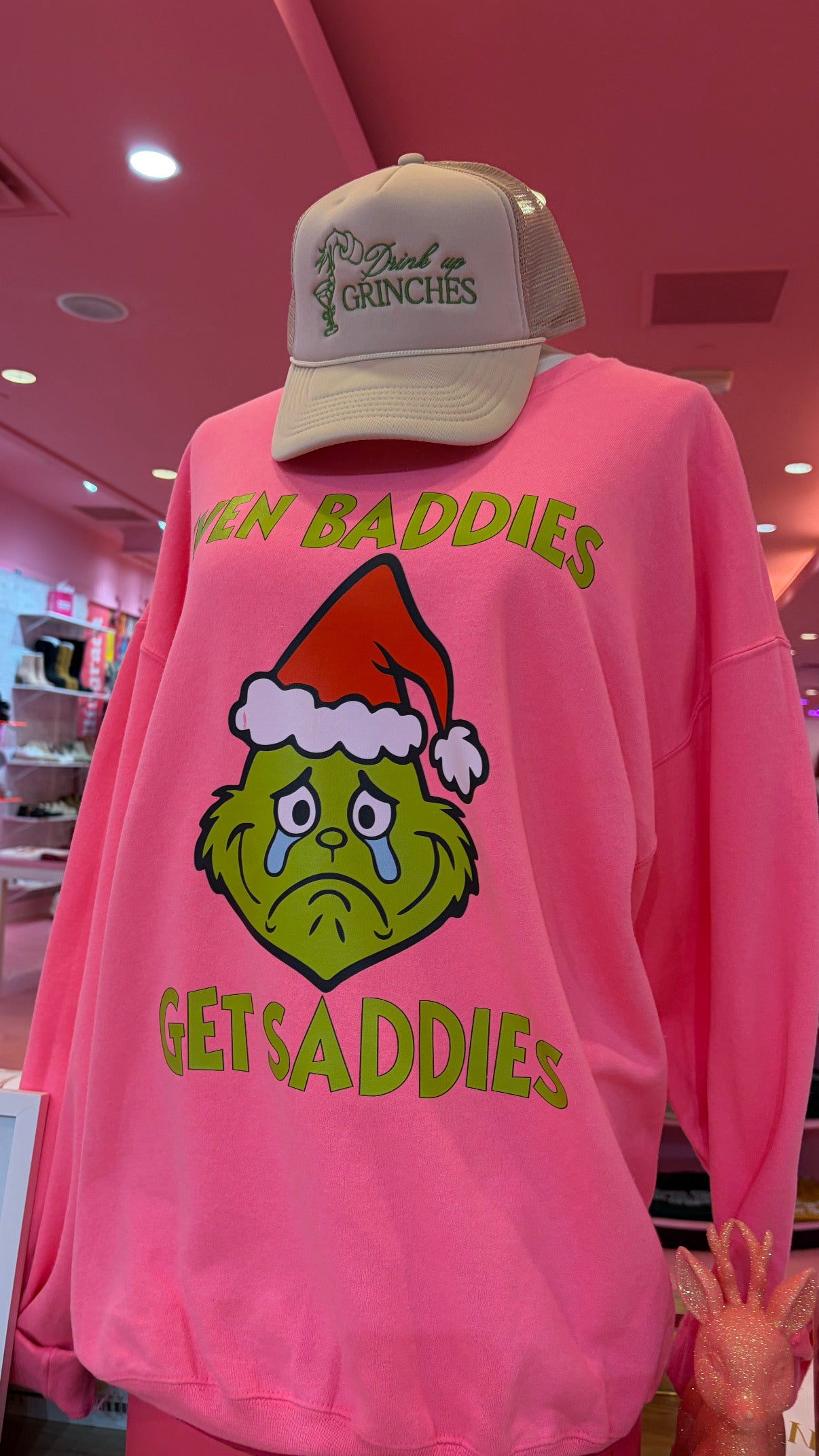 Neon Pink Sweatshirt=Baddies Get Saddies Grinch Version