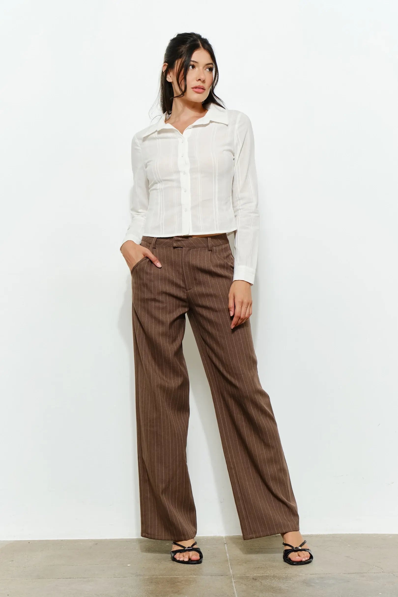 Elevate your look with the Jaslynn Pinstripe Pants! Featuring classic pinstriped fabric, these pants bring sleek sophistication to any outfit. The tailored silhouette includes a fly zip with hook & eye closure, functional belt loops, and faux pockets for a polished finish—making them perfect for work or play. Pair them with your favorite blouse or blazer for refined style that never goes out of fashion.