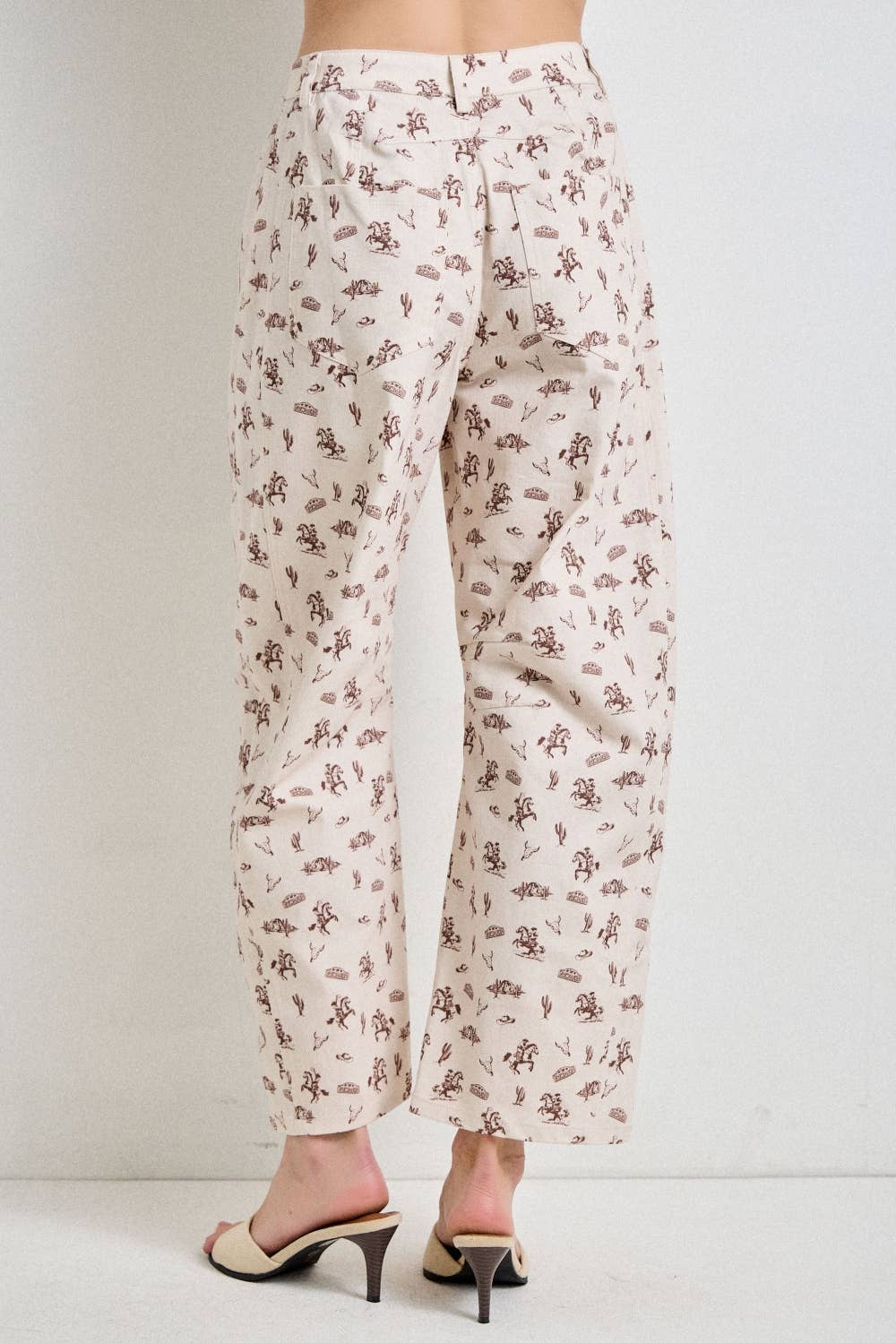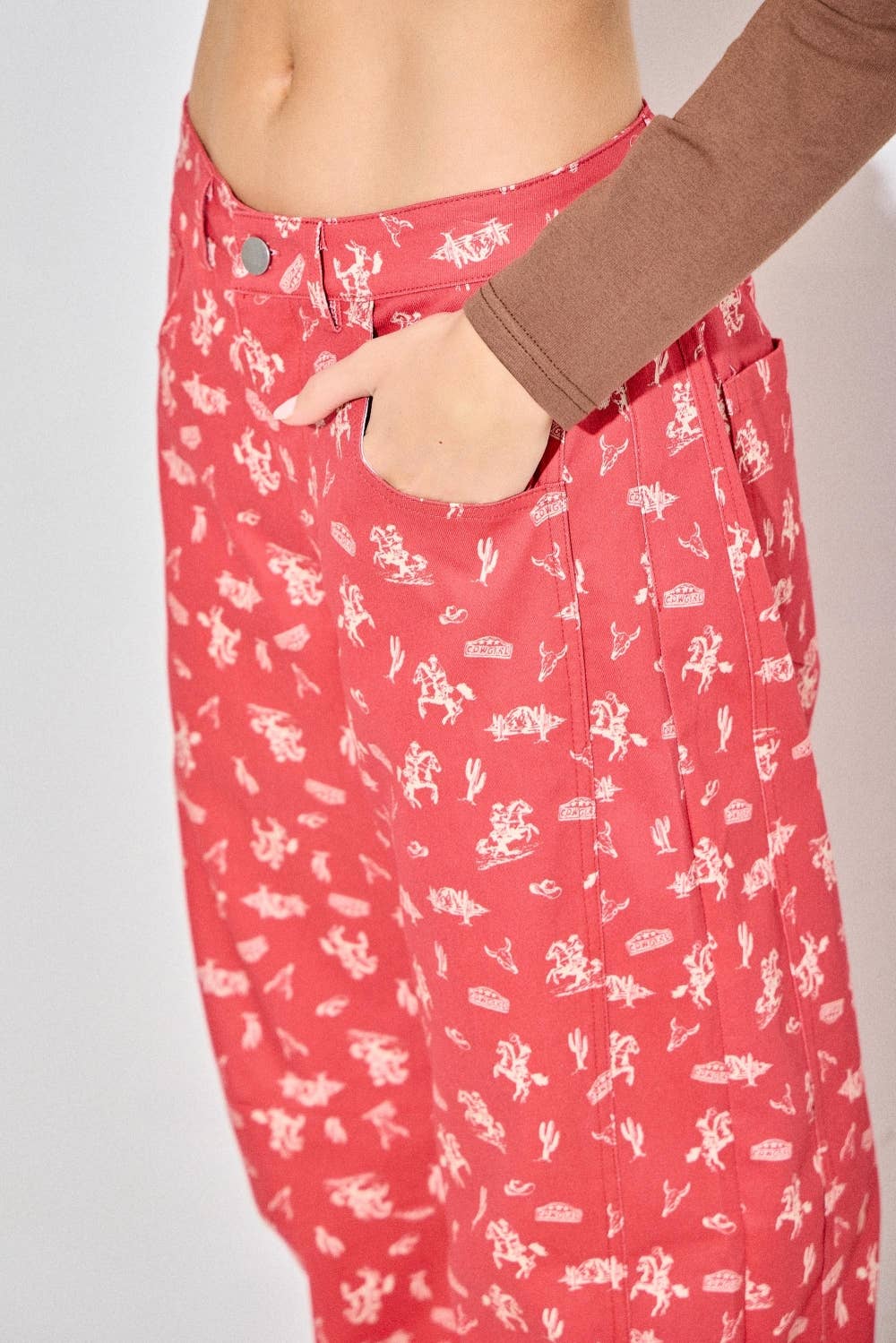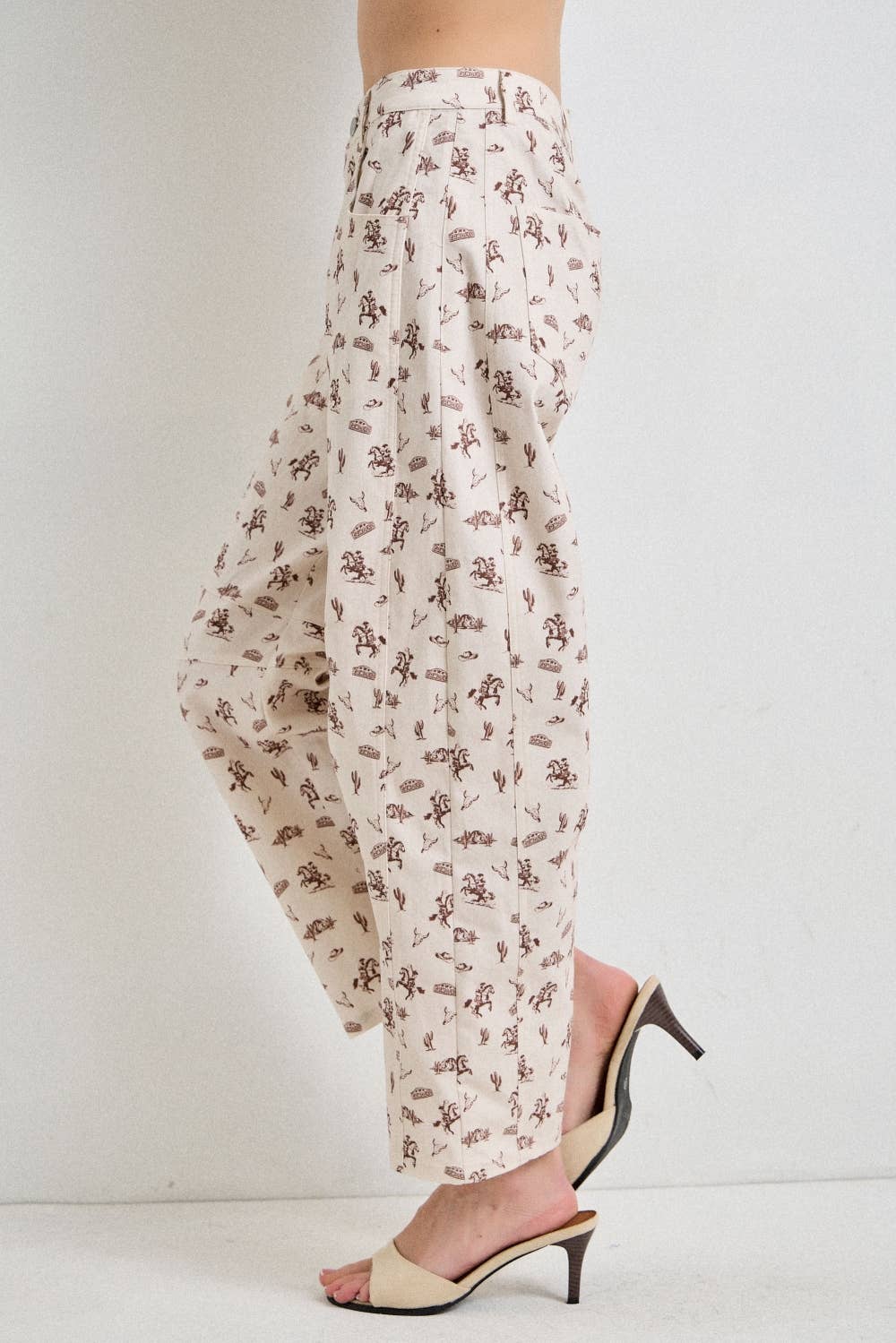 Make a bold statement with these unique trousers featuring a charming all-over Western motif of cowboys, horses, and cacti. The comfortable high-waist fit and straight-leg cut create a flattering silhouette. Perfect for elevated casual wear or pairing with a simple top to let the playful pattern shine.