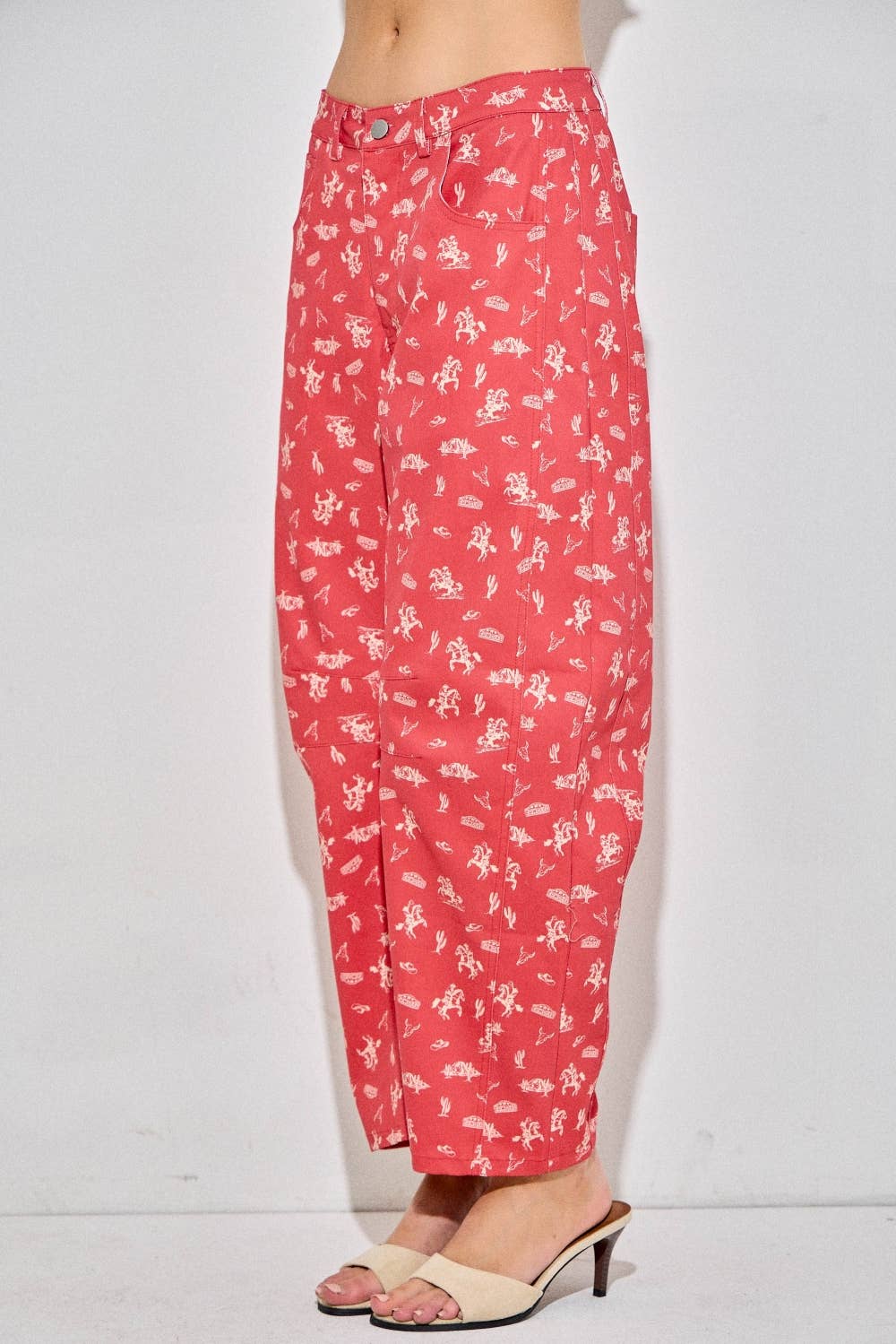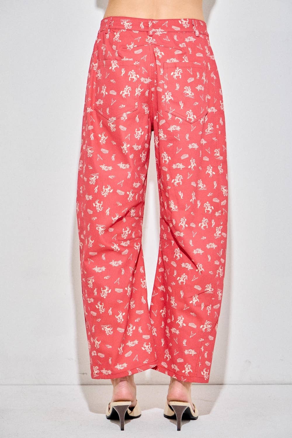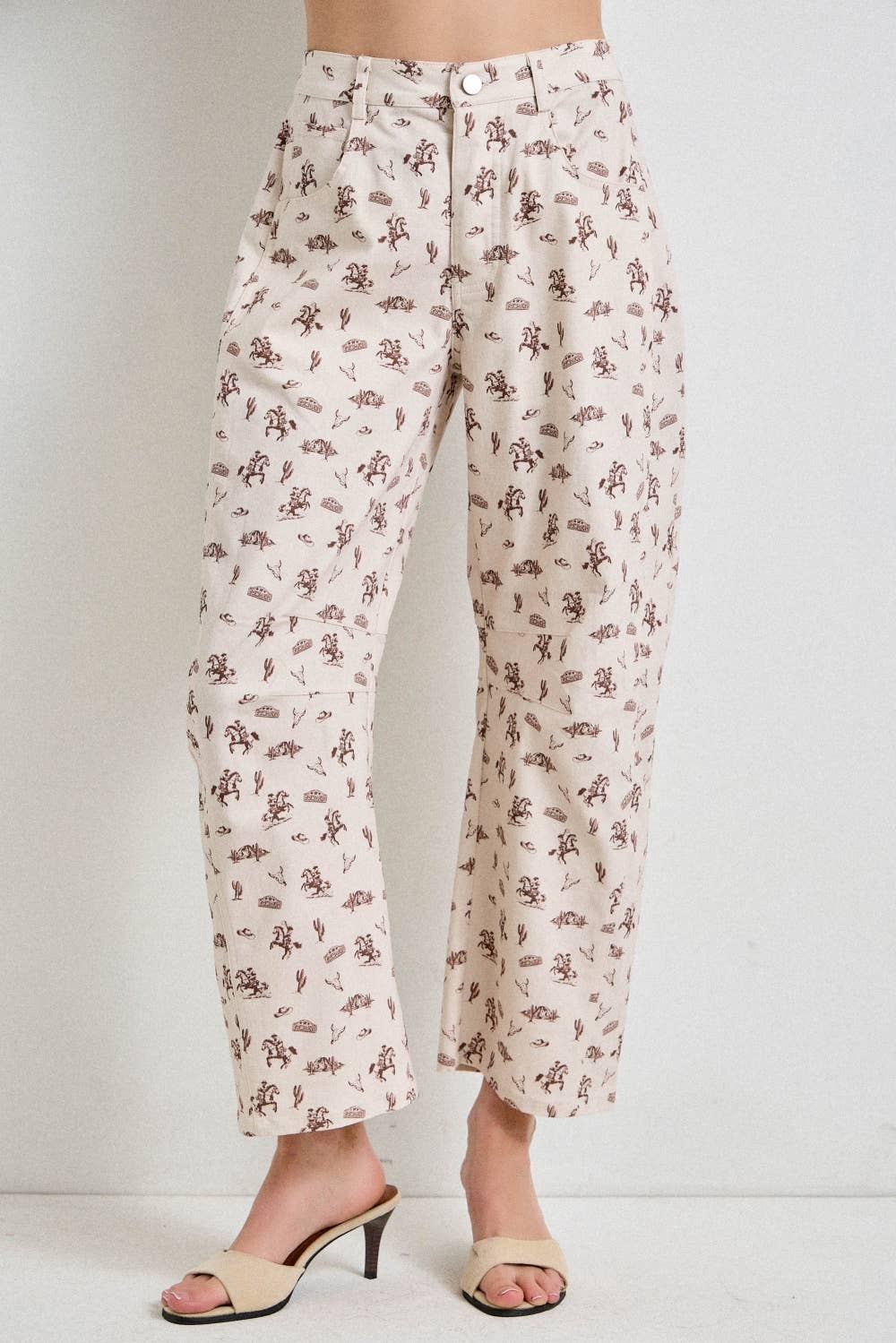 Make a bold statement with these unique trousers featuring a charming all-over Western motif of cowboys, horses, and cacti. The comfortable high-waist fit and straight-leg cut create a flattering silhouette. Perfect for elevated casual wear or pairing with a simple top to let the playful pattern shine.