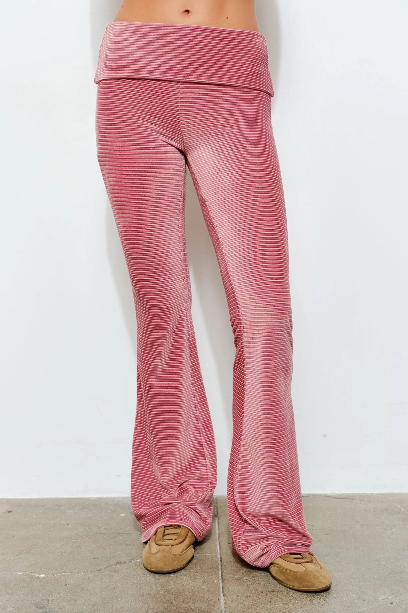 Refresh laid-back style with the Denvor Fold Over Pants—striped ribbed knit flares featuring a comfy fold-over waist for easy, relaxed wear. The soft, stretchy fabric moves with you, while the flared silhouette gives instant attitude. Pair them with the matching top (PST1981-1) or style with basics for effortless mix-and-match looks.