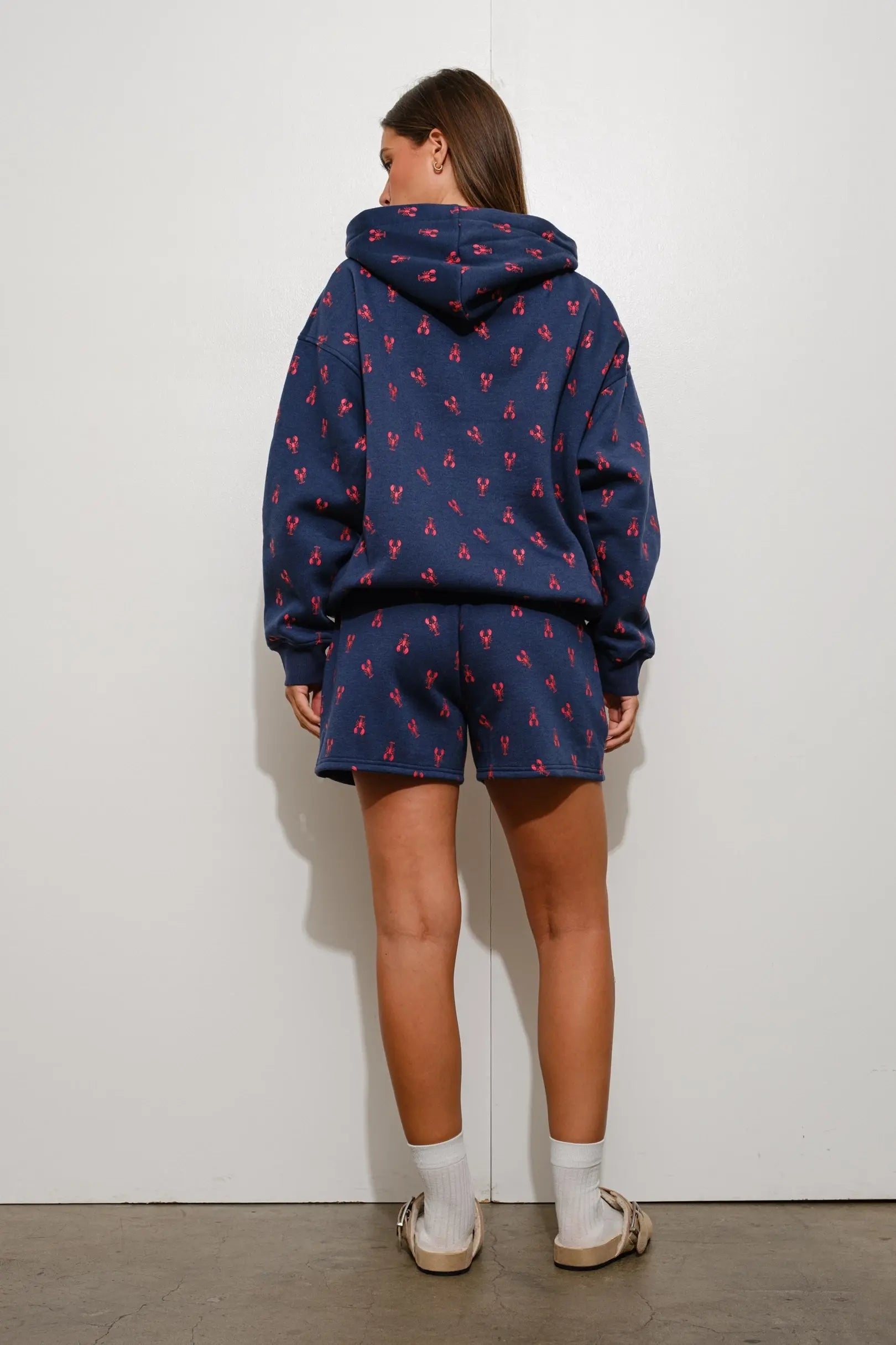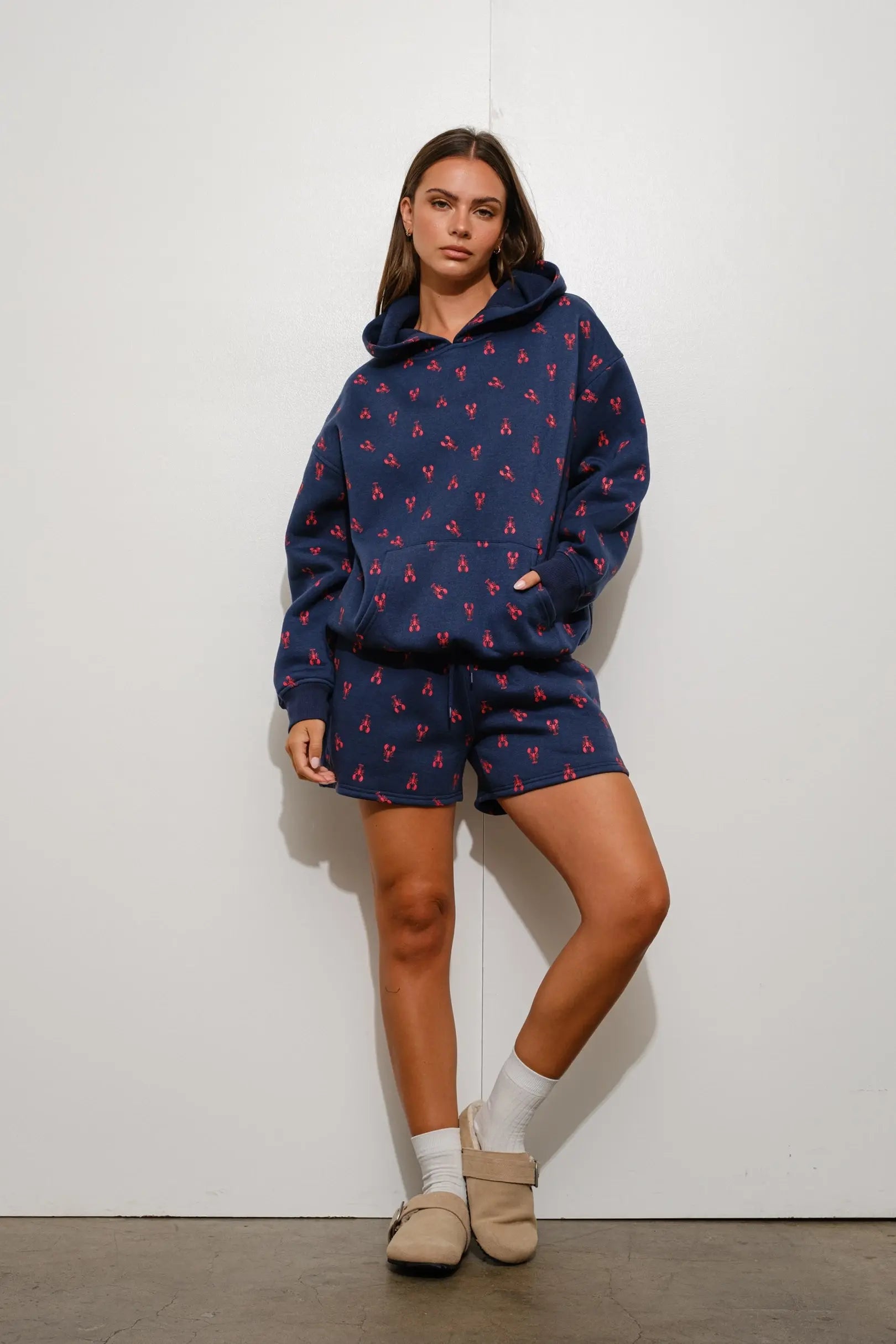Keep it fun and comfy with the August Lobster Sweat Shorts! Made from soft fleece terry fabric, these playful shorts feature an all-over lobster print that adds a splash of whimsy to your casual look. The elasticized waistband with drawstring ensures the perfect fit, while two handy pockets bring both style and function. With their cozy feel and standout design, these shorts are the ultimate mix of comfort and personality—perfect for lounging or laid-back summer days.