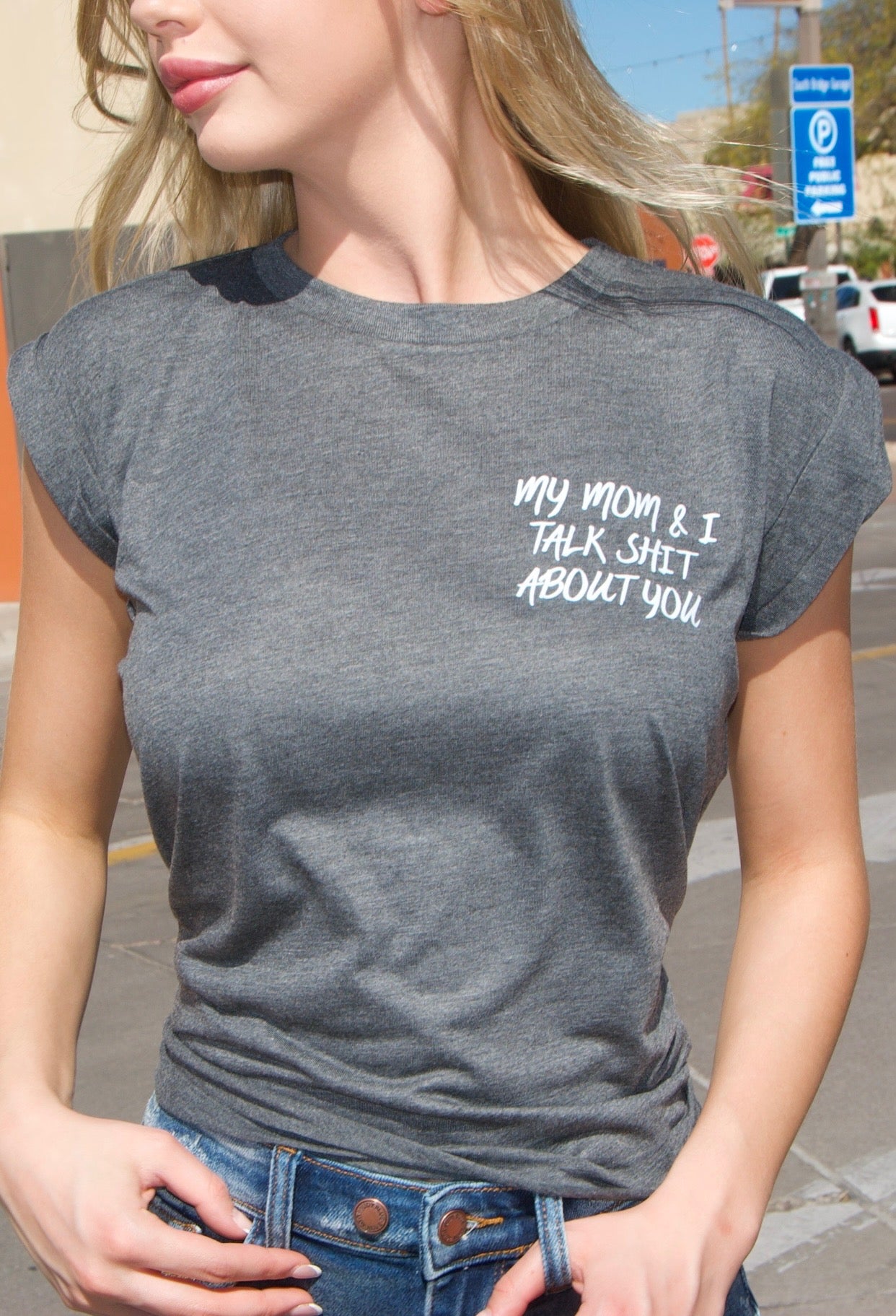 My mom and I talk shit about you on a silky soft grey muscle tee, longer in the back shorter in the front (but still plenty long in front).