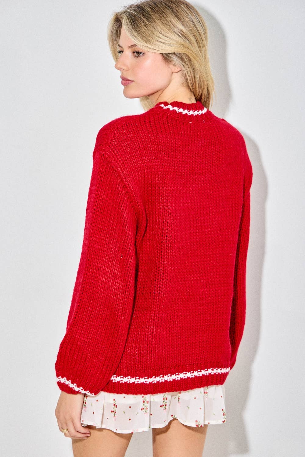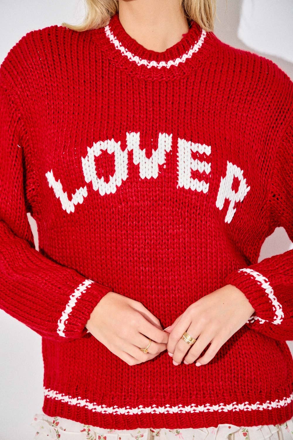 This incredibly cozy, oversized pullover features bold word graphic lettering achieved through intricate intarsia knit. The chunky, hand-knit look and ribbed contrast trim make it a perfect statement piece. Ideal for holiday collections, Valentine's Day, and retro-chic styling. It provides superior warmth and style.