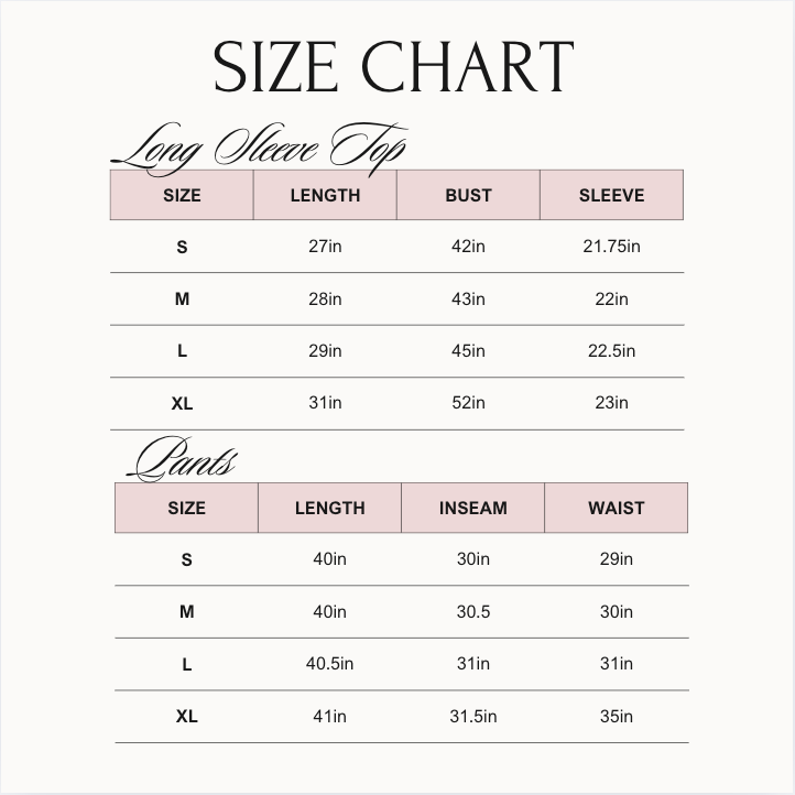 * Buttery- Soft Bamboo Pajama Sets now available in RIBBED material! - Bamboo Sleeper * Long sleeve sleep Top: Notched Collar, Front Button Closure, Long Sleeves Sleep Pants: Elastic Waistband with Drawstring Tie, Hip Pockets, + Relaxed Fit * Model is wearing a size Medium * ! * Care Instructions: Gentle Wash Cold, Inside Out, Tumble Dry Low * Materials: 95% Bamboo Viscose, 5% Spandex, Ribbed Fabric * Sizing Guide is attached.