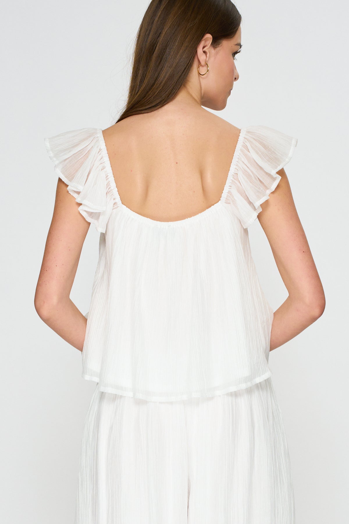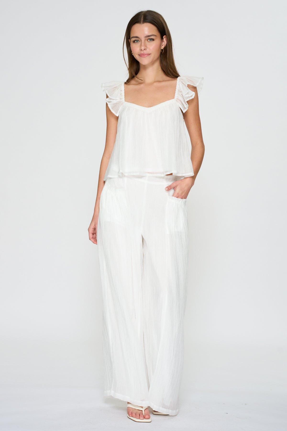 LIGHTWEIGHT SET WITH RUFFLE SLEEVELESS TOP AND FLOWY WIDE LEG PANTS FOR AN EASY ELEGANT LOOK.