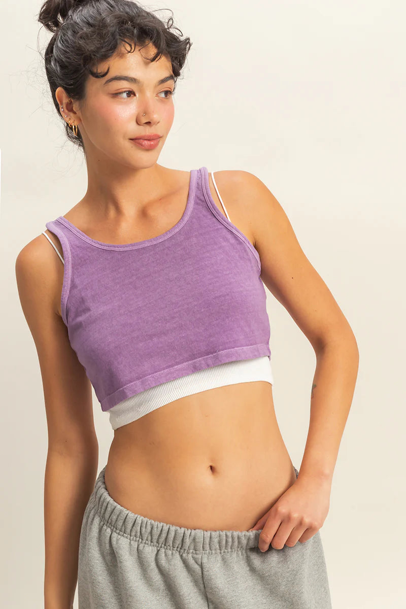 Cropped tank top featuring a scoop neckline, rounded back, and sleeveless design. Constructed with a slightly relaxed bodice and super-cropped hem. Finished with binding accents along the neckline and armholes for a clean look.