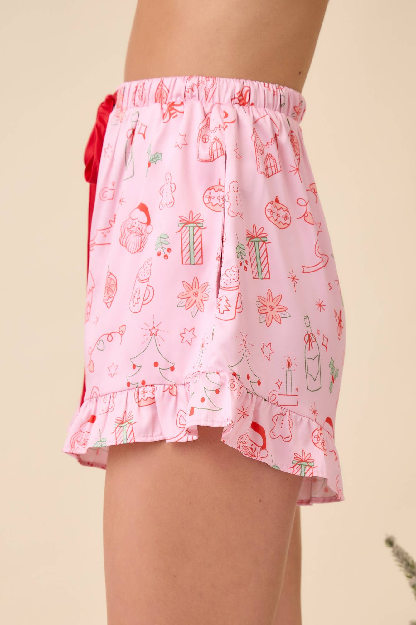 Get cozy and festive with our Pink Christmas Pajama Set. Designed with playful holiday prints, ruffle hem shorts, and red piping details, this pajama set brings a cheerful holiday vibe to Christmas mornings and cozy nights. Perfect for family photos, lounging, or seasonal gifting. ✨ Features: Pink pajama set with festive holiday print Red piping and ribbon tie accents Ruffle hem shorts with matching top Soft and lightweight fabric 🎄