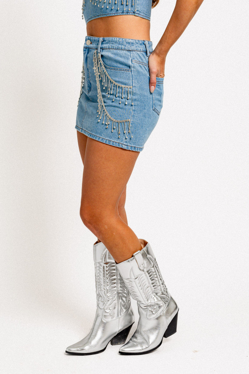 RHINESTONE DETAIL LOW WAIST DENIM SKIRT