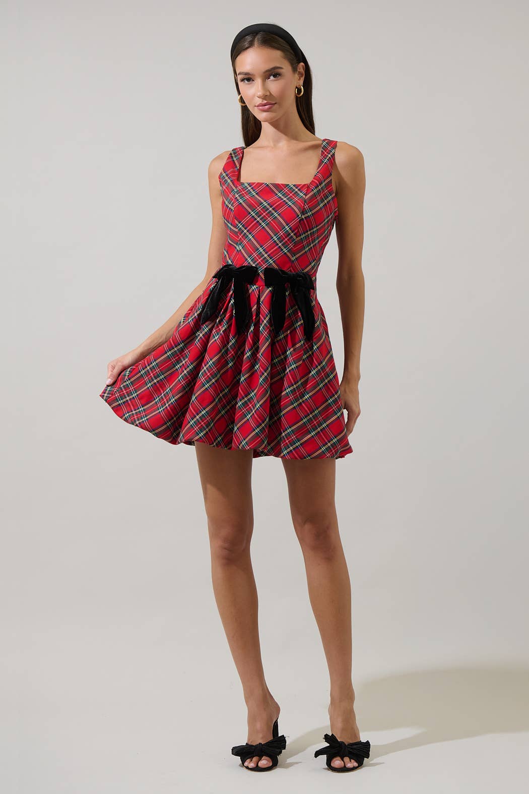Turn up the cuteness factor with this stylish dress. This plaid mini features a sleeveless cut, front waist bows, and a smocked back for comfort. A side invisible zipper keeps it sleek, while the bubble hem adds playful flair. Perfect for parties or casual gatherings—pair with heels and a chic clutch. - Sleeveless - Mini - Smocked back - Zipper -+ Fit - Model is 5'9" and wearing size XS - Measurements taken from size S - Chest: 16 1/2" - Length: 34"